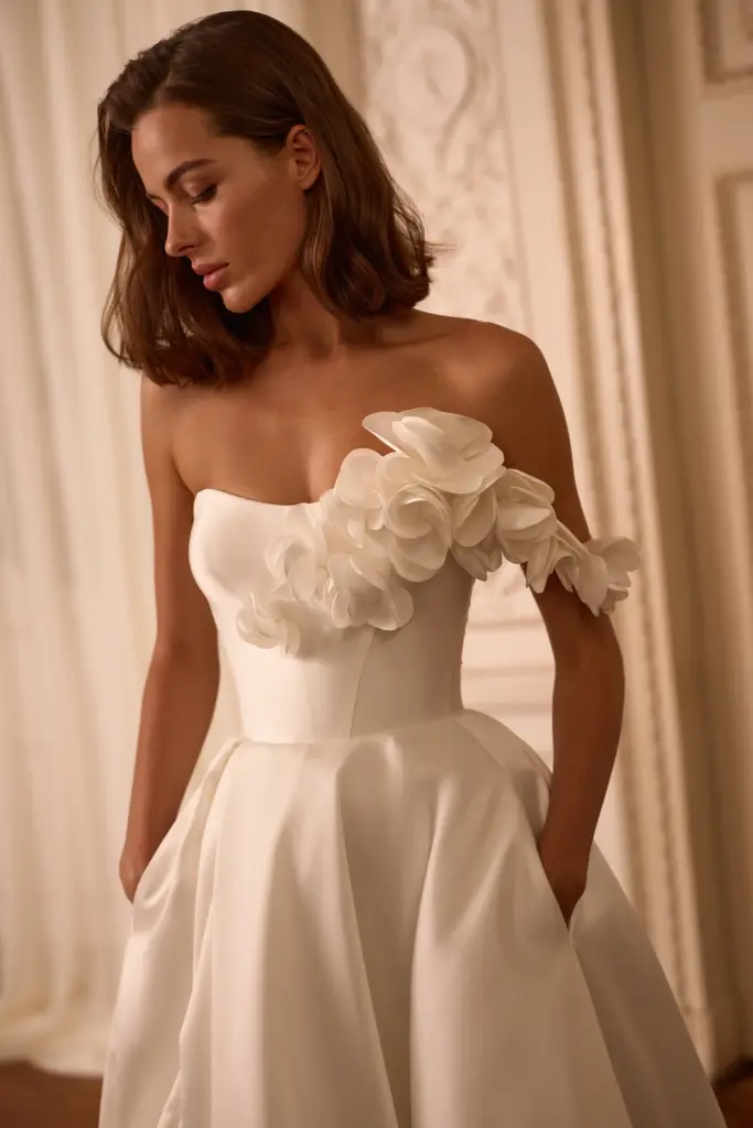 Сукня А силуету. Виконана з розкішного мікадо молочного кольору. Корсет з ніжною, тоненькою бретелькою прикрашений квітковою аплікацією ручної роботи.