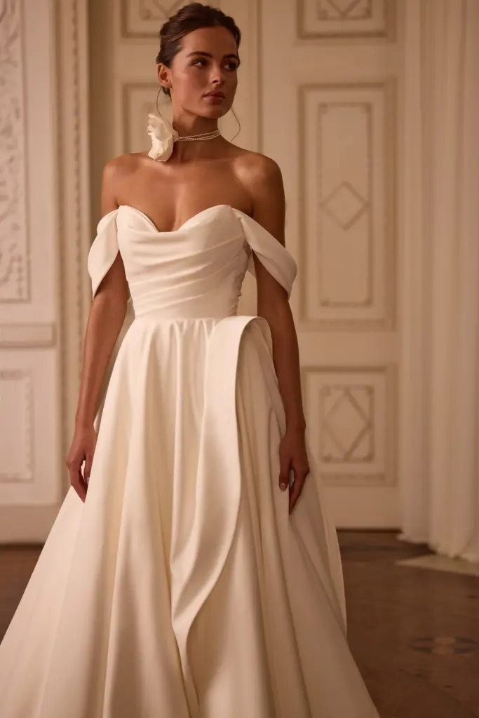 Сукня має пишний А силует. Ліф зі з’ємними бретелями, з м’якими, драпірованими складками. Висока талія плавно переходить у спідницю, що розширюється донизу, створюючи витончений силует. А головна родзинка – великі, знімні квіти. Вони додають сукні особливого шарму та дозволяють змінювати образ, створюючи різні варіації стилю