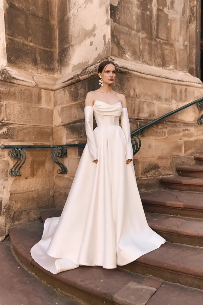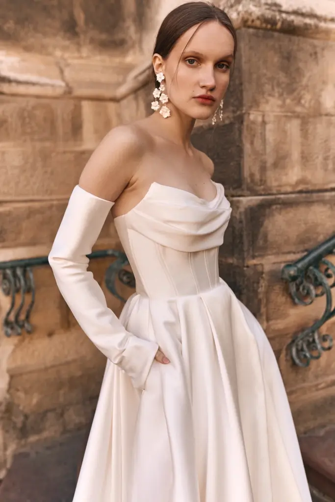 Корсет щільно фіксує фігуру, підкреслюючи талію та надаючи образу витонченості. Елегантне драпірування красиво підкреслює зону декольте та приховує всі недоліки. Образ доповнюють прямі довгі рукава.