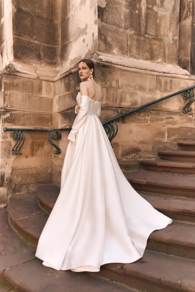 Довгий шлейф створює ефект урочистості, а високий розріз на нозі додає сучасності й легкого відтінку сміливості