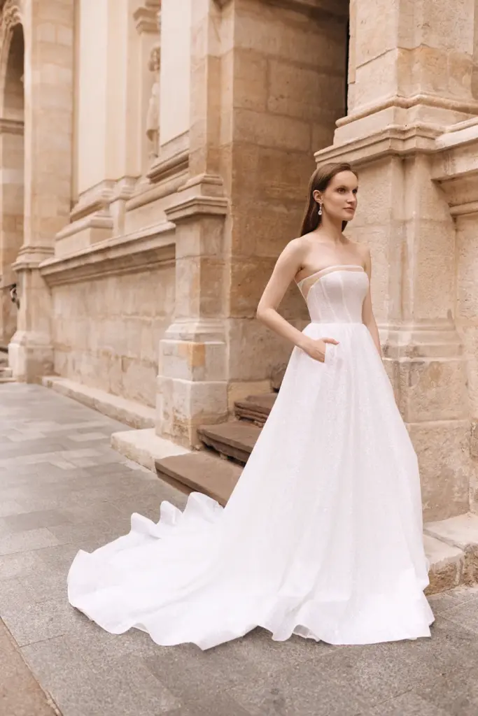 Пишна спідниця з витонченим шлейфом створює ефект розкішного об’єму, а кишеньки — стильний і зручний акцент.