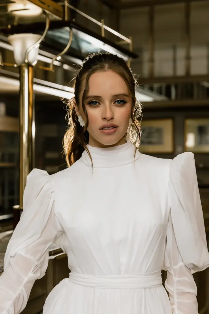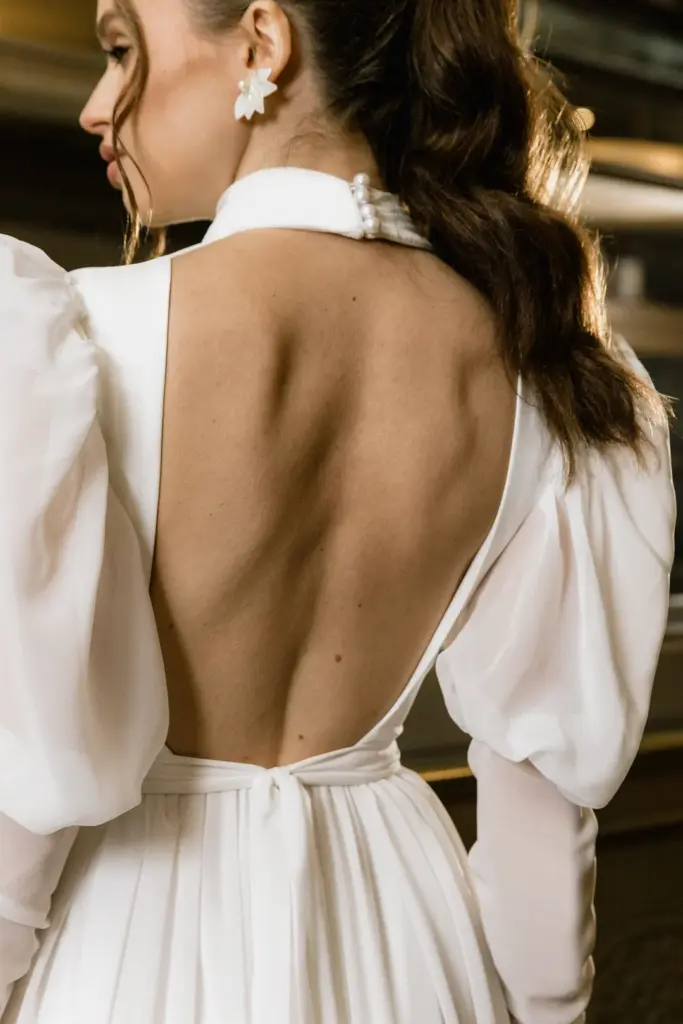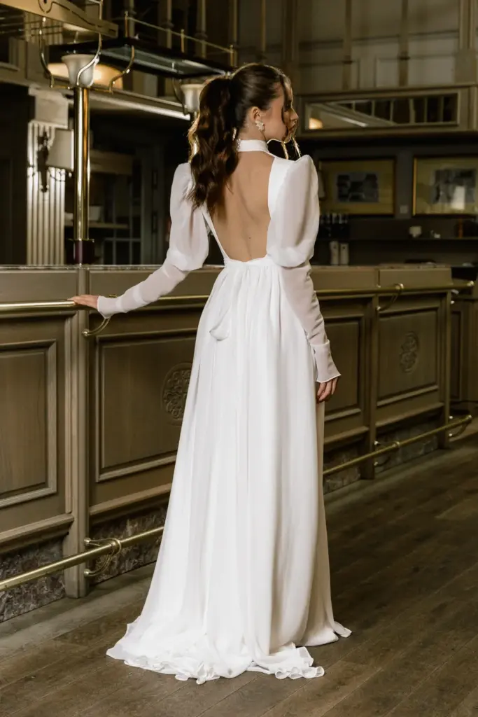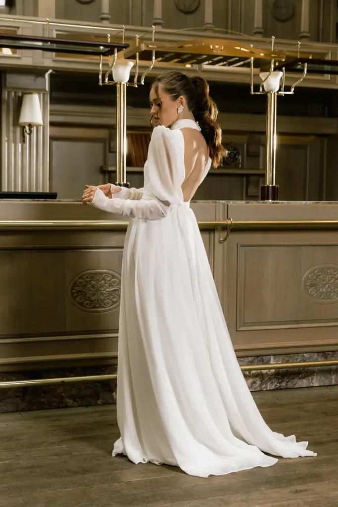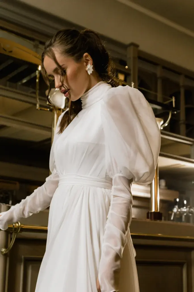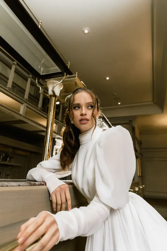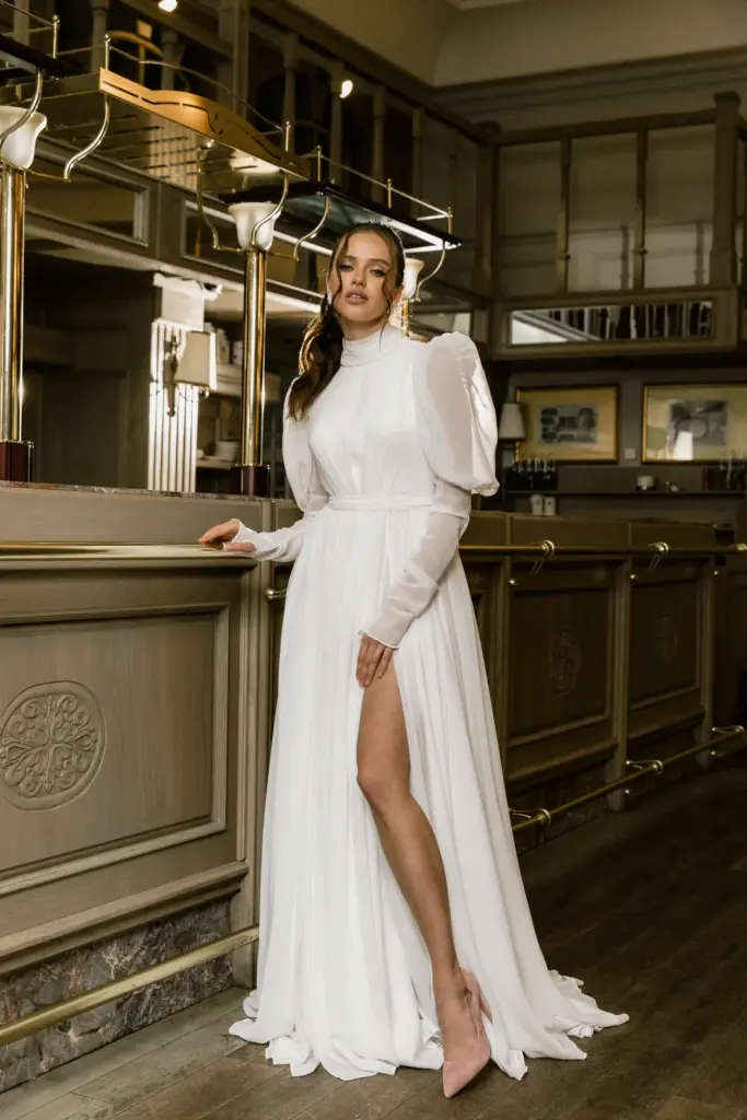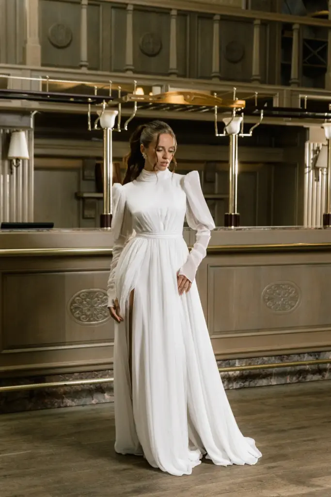 Вишукана сукня з довгими пишними рукавами та високим коміром, застібнутим на перлинні ґудзики. На перший погляд вона може здатися надто простою, проте вона втілює образ справжньої жінки. Така скромна та стримана зовні, але з палаючим вогнем всередині. Високий розріз на спідниці підкреслює стрункі ноги. Пояс завязується акуратним бантом ззаду.