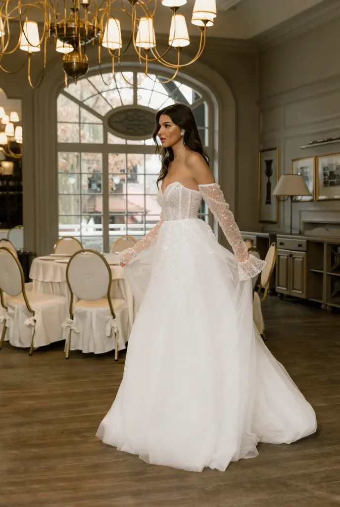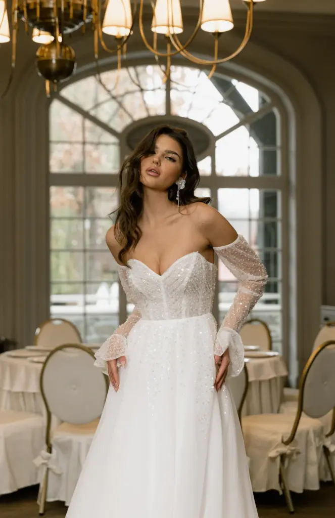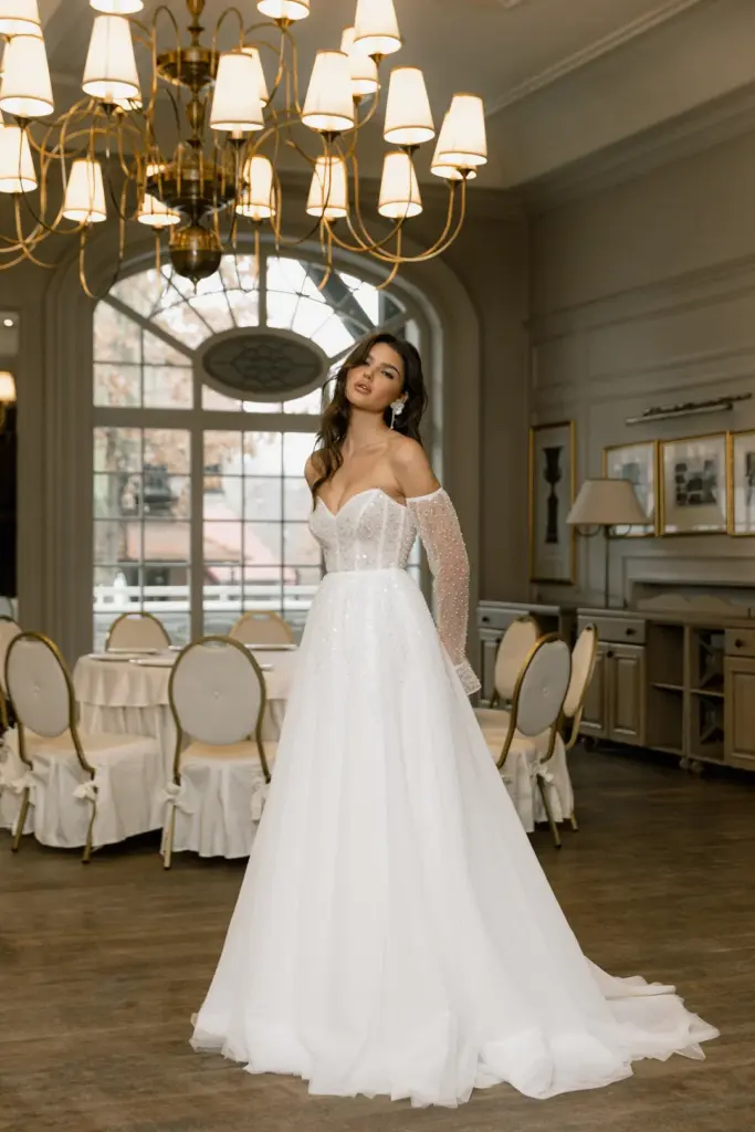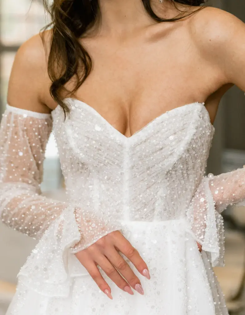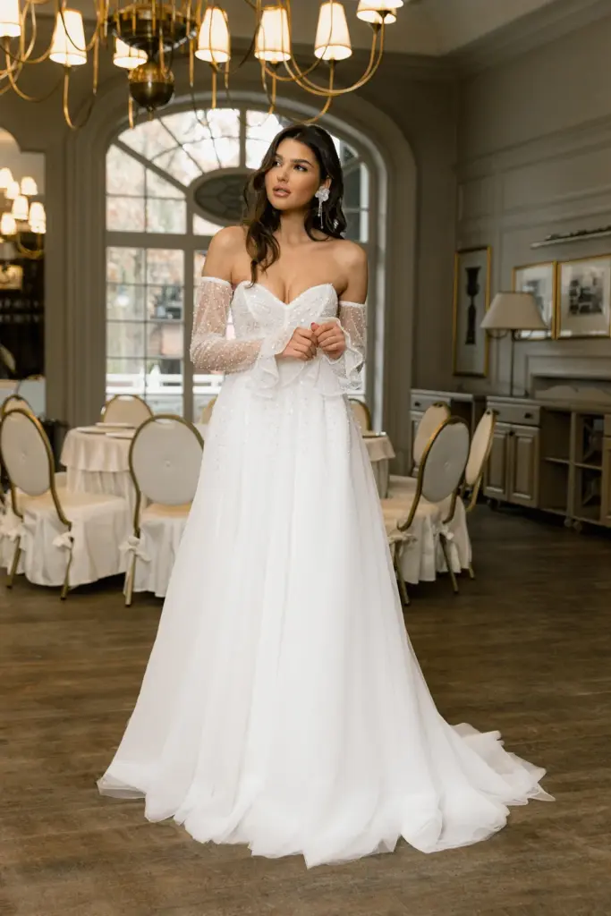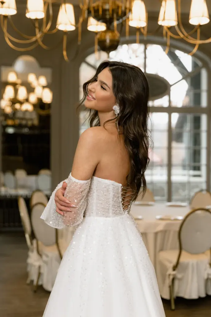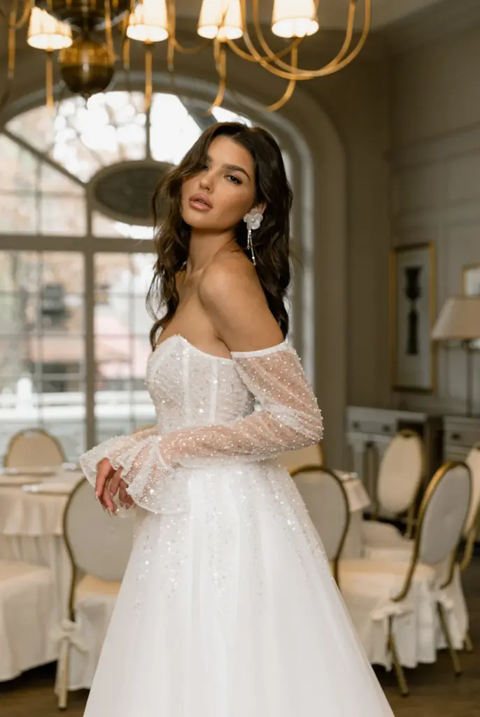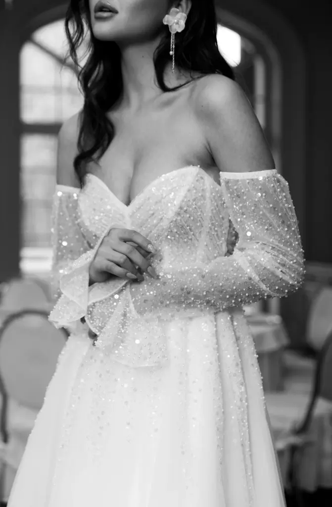 Ніжна сукня з легким мерехтінням сподобається романтичній особі. Її переливи заворожують і притягують погляд. Ліф з глибоким декольте декорований драпіруванням і прикрашений перлами, блискітками та намистинами. Вони спадають на повітряну спідницю дрібним розсипом, немов промені, створюючи плавний перехід. Зємні рукава з воланами ідеально гармонують із сукнею, доповнюючи її.
