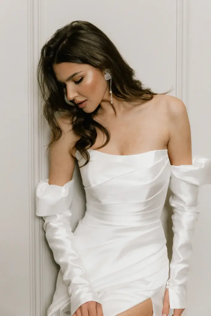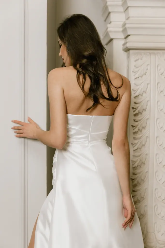Вишукана весільна сукня для справжньої леді. Хвиляста тканина, що м’яко облягає силует, захоплює своєю простотою. Вона не відволікає увагу від нареченої, а робить її особливою та притягує погляди. Родзинкою сукні є відстібні рукави, які вигідно підкреслюють плечі. Високий розріз на спідниці м’яко відкриває ніжку, а невеликий шлейф додає легкості образу.