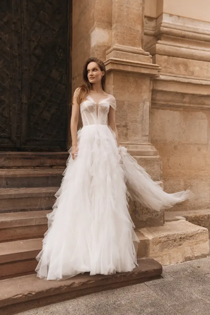 Ця унікальна модель поєднує легкий тюль з витончено розташованими оборками, створюючи ефект легкості та повітряності. Корсетний ліф, виготовлений із вишуканого мережива та ніжних тканин, надає силуету чутливий контур, зберігаючи при цьому повний комфорт та елегантність. Витончені рукава з відкритими плечима додають шарму і дозволяють вільно рухатися. Довгий напівпрозорий шлейф, який ледь доторкається до підлоги за нареченою, забезпечує вражаючий ефект кожним кроком