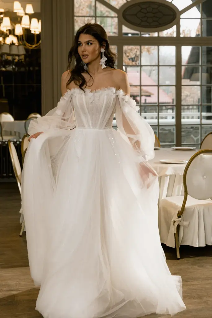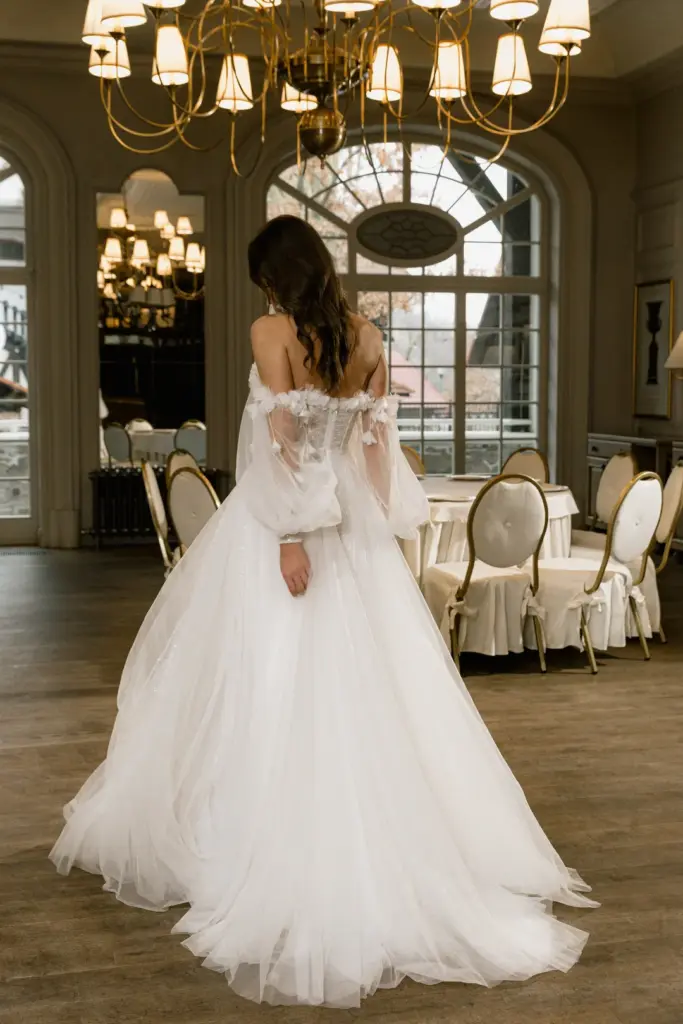 Це не просто сукня, а саме втілення ніжності. М’яке мерехтіння паєток у поєднанні з драпіруванням на ліфі приковує увагу. Виріз горловини у формі серця обрамлений дрібними квітами з напівпрозорими пелюстками, які плавно переходять на рукави та спину, роблячи образ настільки легким, романтичним і завершеним, що захоплює дух. Об’ємні рукави з манжетами, невагомими, як хмари, огортають силует, підкреслюючи витонченість та струнку фігуру нареченої. Спідниця, прикрашена клинами з мережива, розшитого бісером та паєтками, розкльошується внизу, немов розквітла брунька.