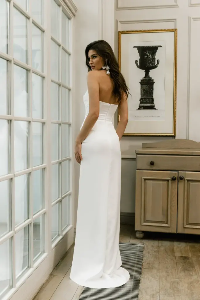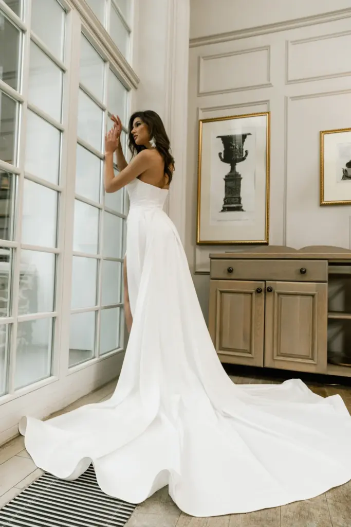 Елегантна сучасна сукня в підлогу прямого силуету. Ліф сукні з вирізом у формі серця декорований легкою драпіровкою. Ззаду має блискавку. Косий розріз, що йде до середини стегна, м’яко відкриває стрункі ніжки під час ходьби. Особливою родзинкою сукні є розкішний відстібний шлейф. Він буде доречним під час урочистої частини свята та стане важливим атрибутом для фотосесії. Але для танців його краще зняти.