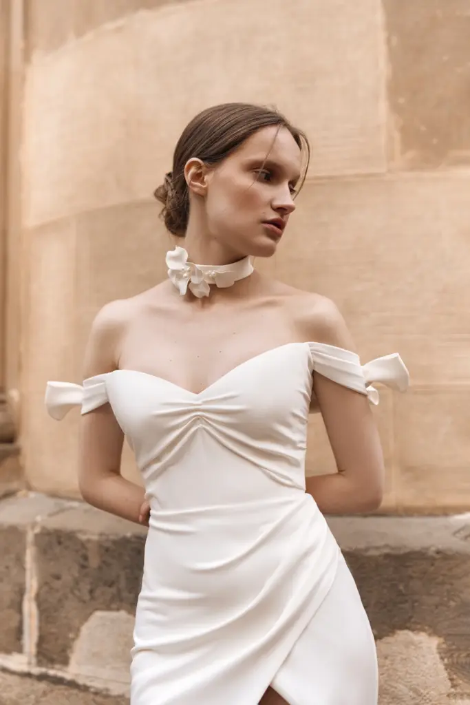 Приталена сукня з еластичного стрейч атласу. Корсет з чашками чудово моделює фігуру, а драпірування на ліфі та спідниці додає балансу мінімалістичному силуету. Грайливий розріз на спідниці додає нотку руху та чуттєвості. Тоненькі спадаючі рукавчики з бантиками додають образу ніжності