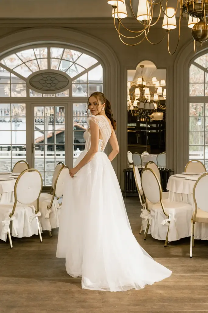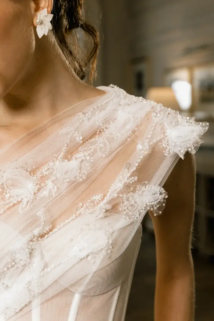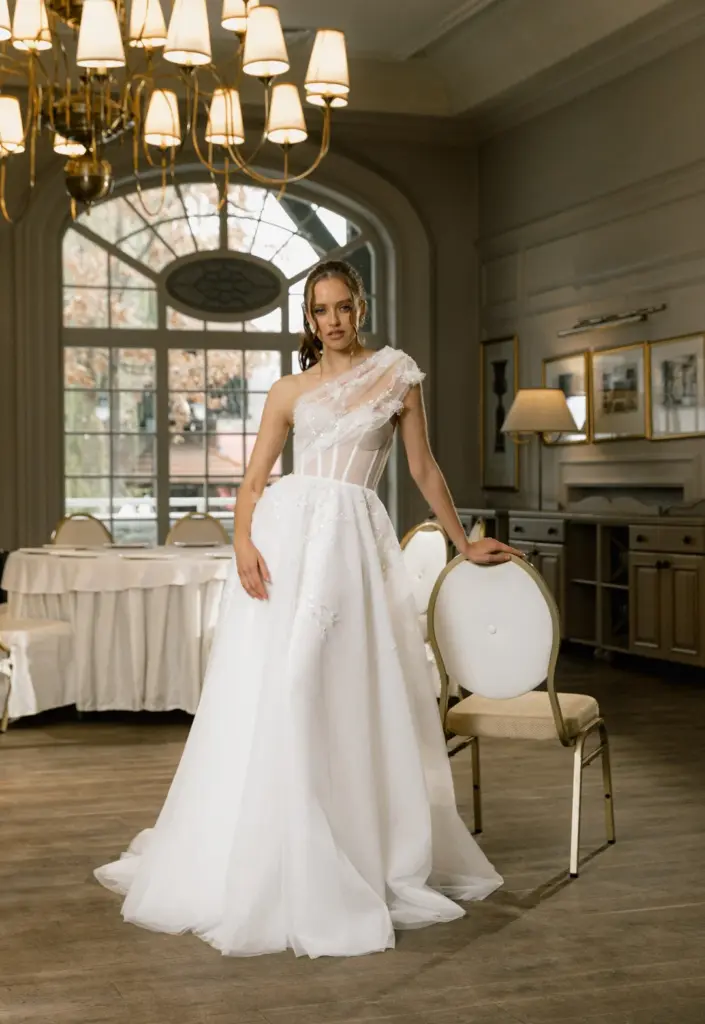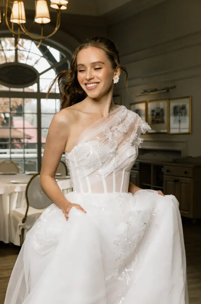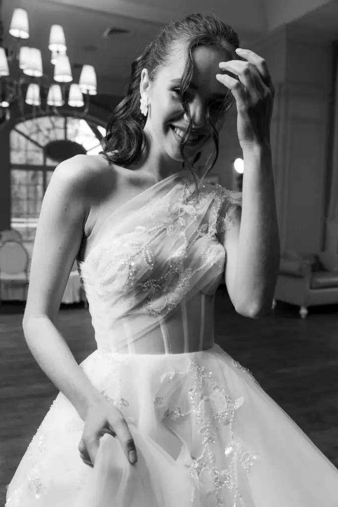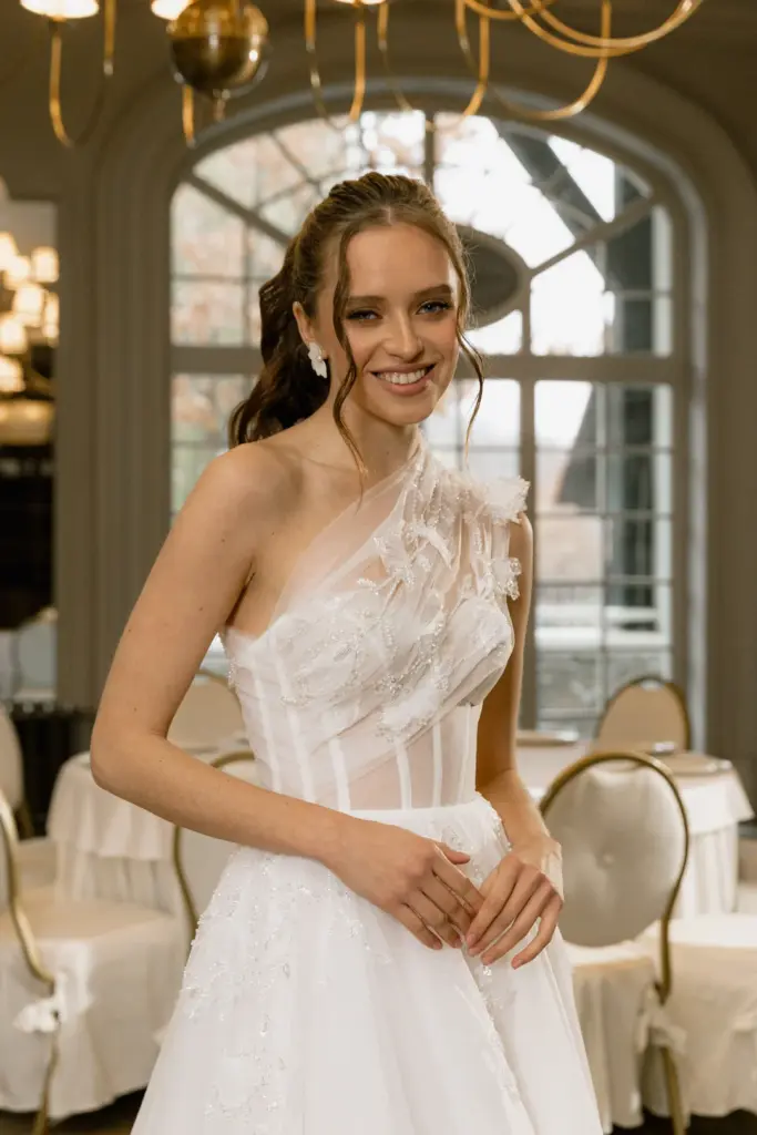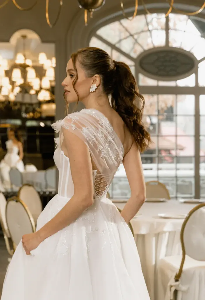 Лаконічна, але розкішна сукня. Корсетний верх зі шнурівкою м’яко відкриває витончену спину. Довга пишна спідниця має невеликий шлейф, що робить образ романтичним. Драпірований елемент сукні, що закриває одне плече та вишитий бісером і паєтками, додає особливого шарму. Верхня частина спідниці прикрашена тими ж квітковими мотивами. Вся ця копітка робота виконується вручну, щоб підкреслити вашу унікальність та передати святковий дух.