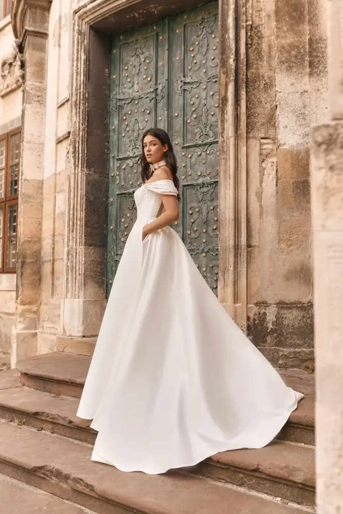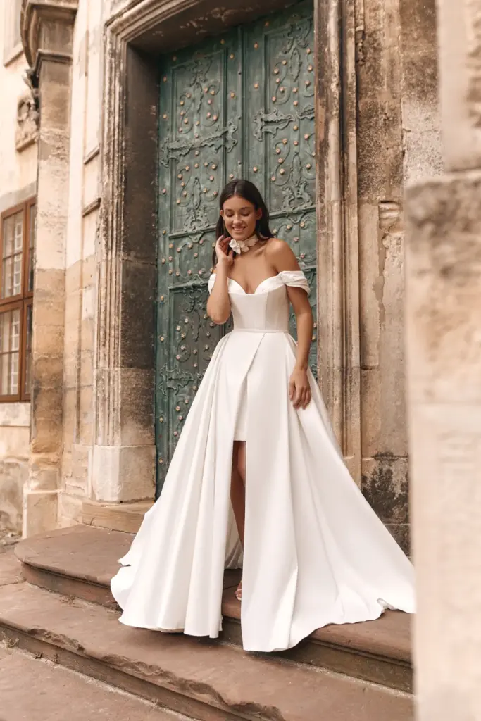 Символ універсальності та вишуканості. Ця сукня А силуету має чарівну міні-спідницю з еластичного Мікадо, яка випромінює елегантність у ніжному відтінку слонової кістки. Особливістю сукні є знімна спідниця, яка надає можливість змінити стиль від шикарного міні-плаття до більш традиційного вигляду нареченої. Високий воротник-гольф корсету додає унікальний шарм цій сукні, роблячи її неперевершеною в усіх деталях.
