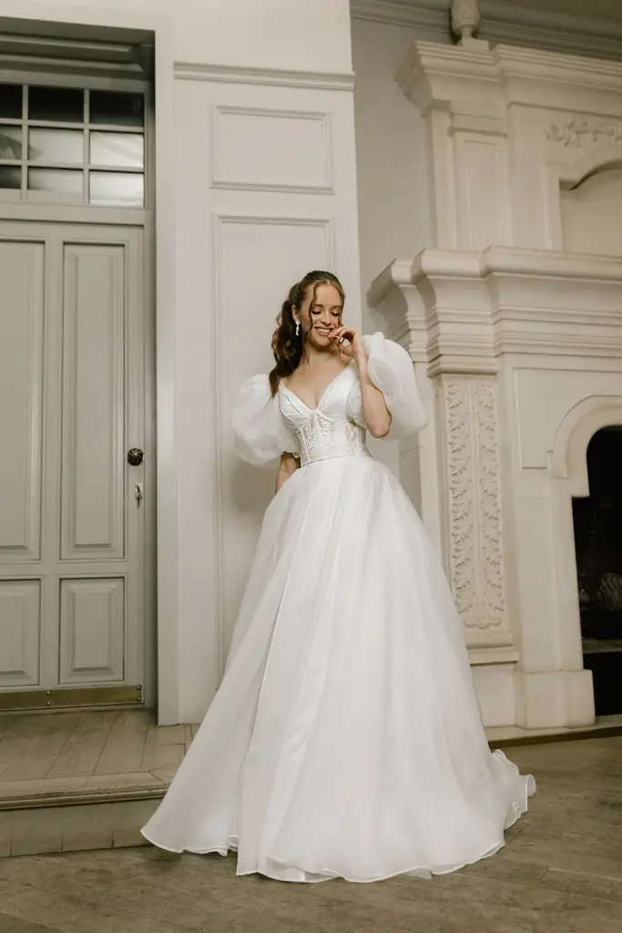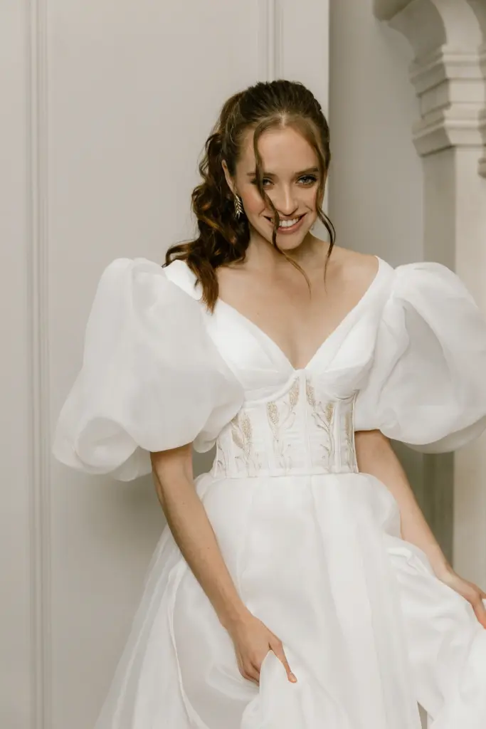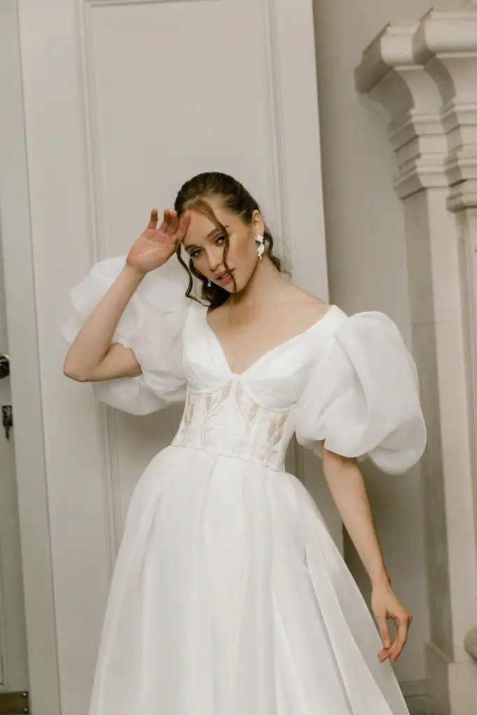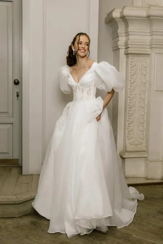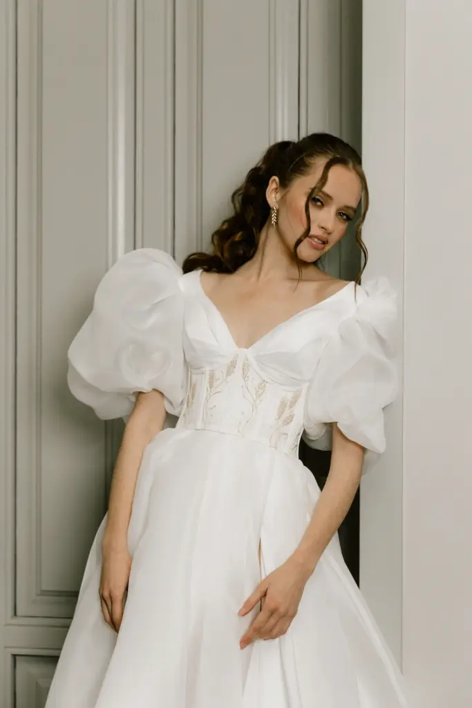 Класична сукня для справжньої принцеси. Об’ємні пишні рукави, немов розквітлі квіти, гарне ефектне декольте та пишна невагома спідниця з органзи, яка додає легкості всьому образу. Високий розріз грайливо відкриває стрункі ніжки нареченої. Корсет, прикрашений золотими шипами, підкреслює талію. А якщо ви хочете легшого та романтичнішого ефекту, корсет можна легко зняти. Таке легке перетворення урізноманітнить вашу весільну фотосесію.