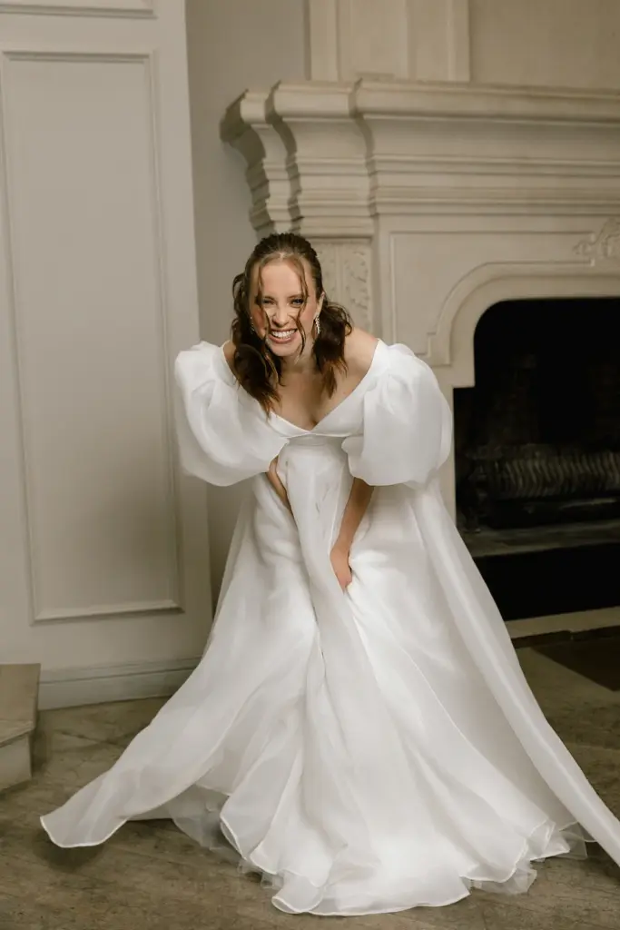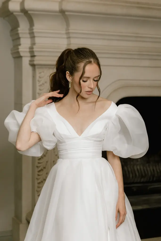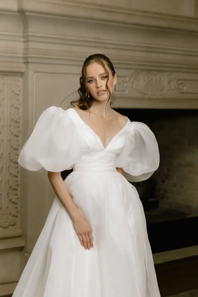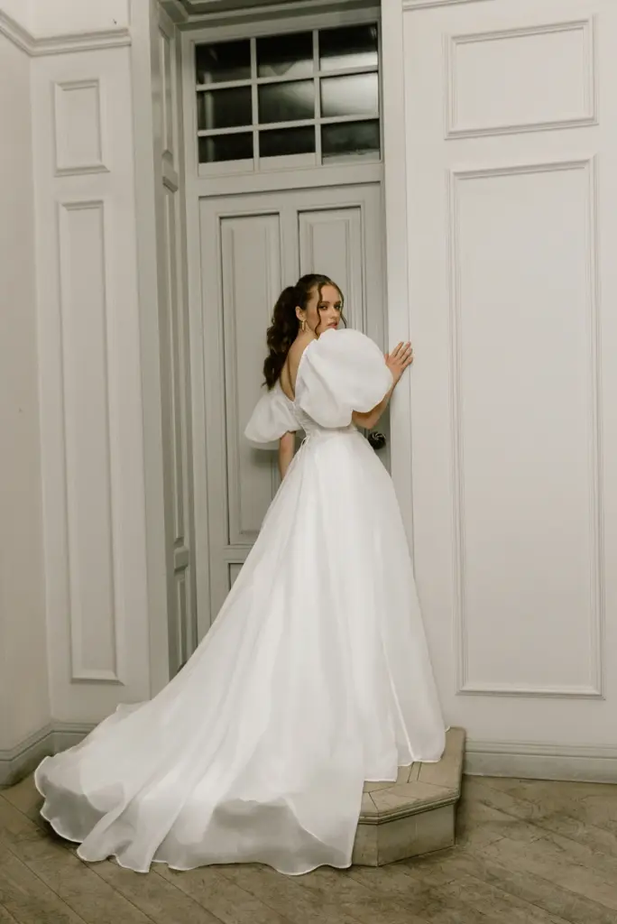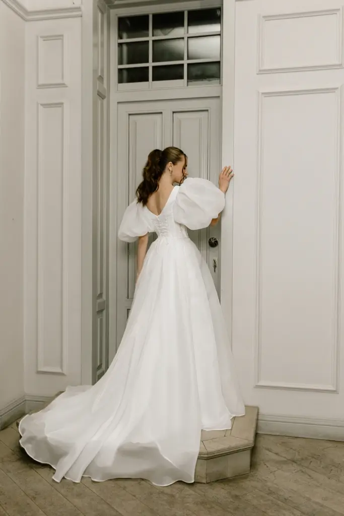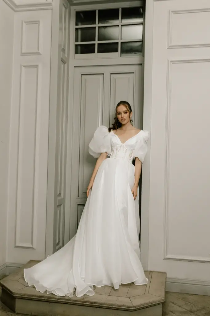 Класична сукня для справжньої принцеси. Об’ємні пишні рукави, немов розквітлі квіти, гарне ефектне декольте та пишна невагома спідниця з органзи, яка додає легкості всьому образу. Високий розріз грайливо відкриває стрункі ніжки нареченої. Корсет, прикрашений золотими шипами, підкреслює талію. А якщо ви хочете легшого та романтичнішого ефекту, корсет можна легко зняти. Таке легке перетворення урізноманітнить вашу весільну фотосесію.