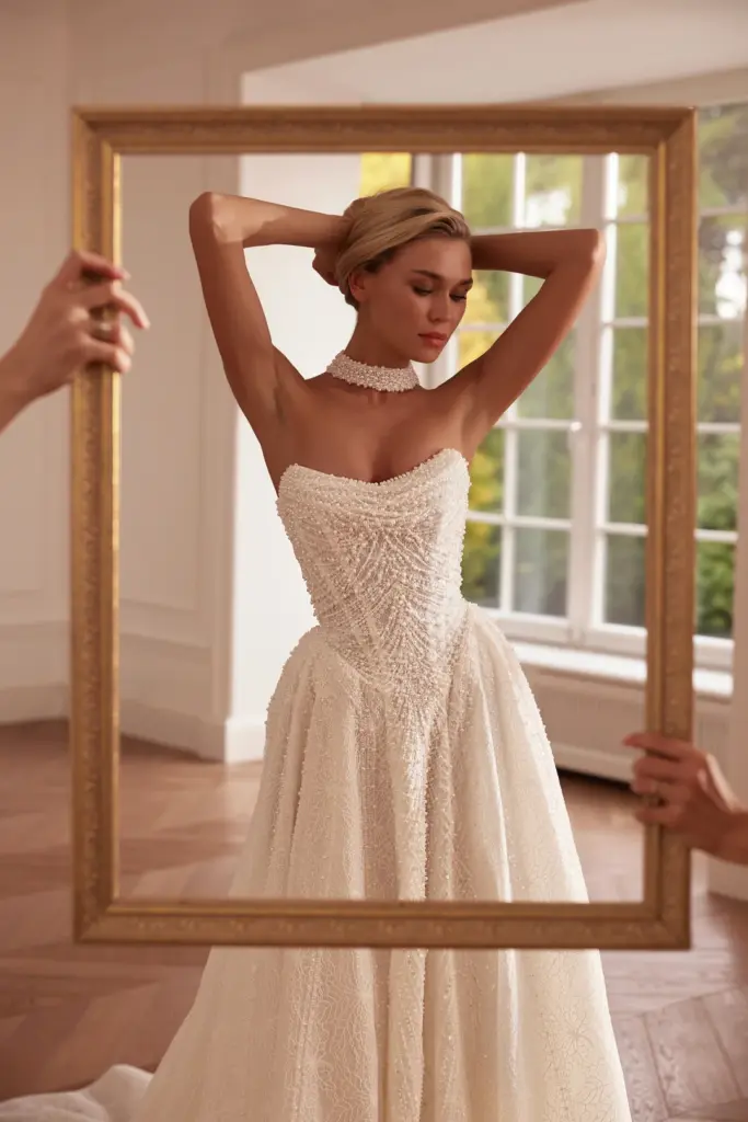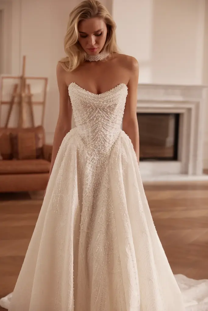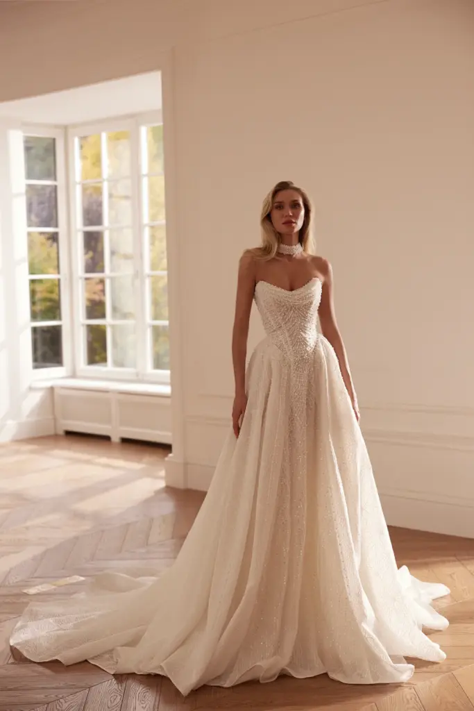 Спідниця — пишна, з легким шлейфом, м’яко спадає до підлоги, створюючи плавну, королівську лінію силуету. Тканина виглядає об’ємно, але водночас повітряно.