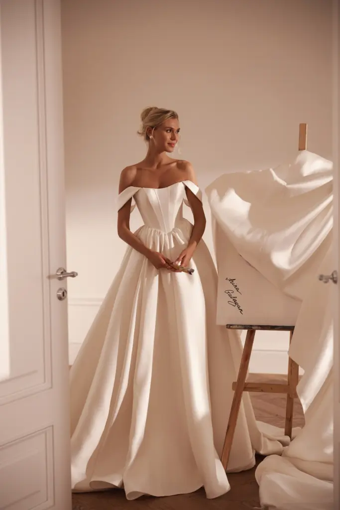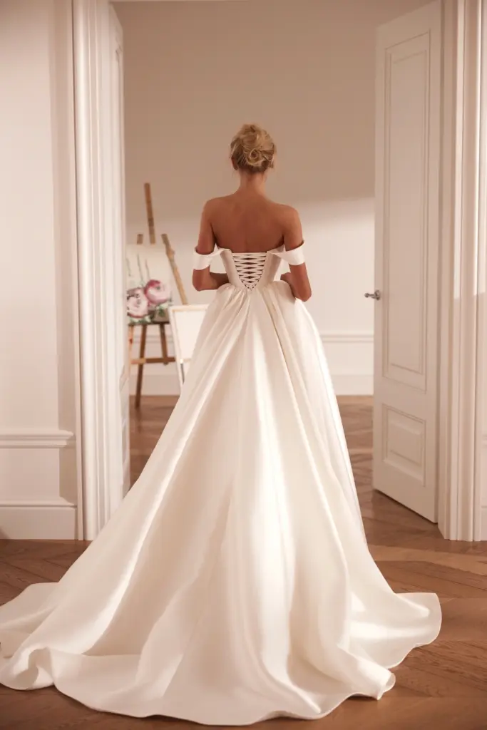 The dress is sewn from dense mikado, which keeps its shape.